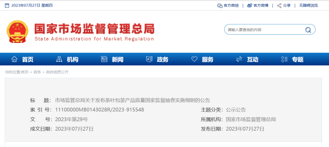 据悉,2023年9月1日,《限制商品过度包装要求 食品和化妆品》(GB23350-2021)强制性国家标准将正式实施。当下《茶叶包装产品质量国家监督抽查实施细则》进一步给出了判定规则和判定原则,值得行业保持高度关注。文件原文如下: