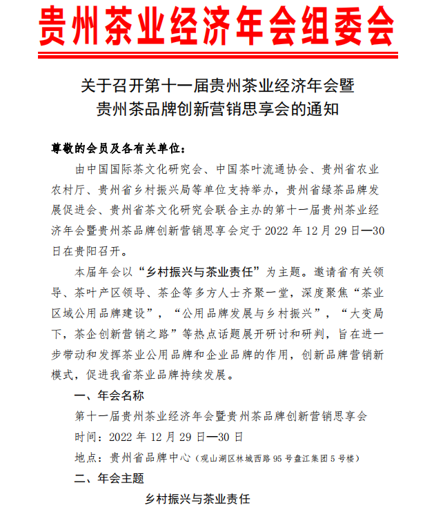 12月29日,第十一届贵州茶业经济年会将在贵阳市贵州省品牌中心召开,让我们翘首以盼,共襄盛会吧!