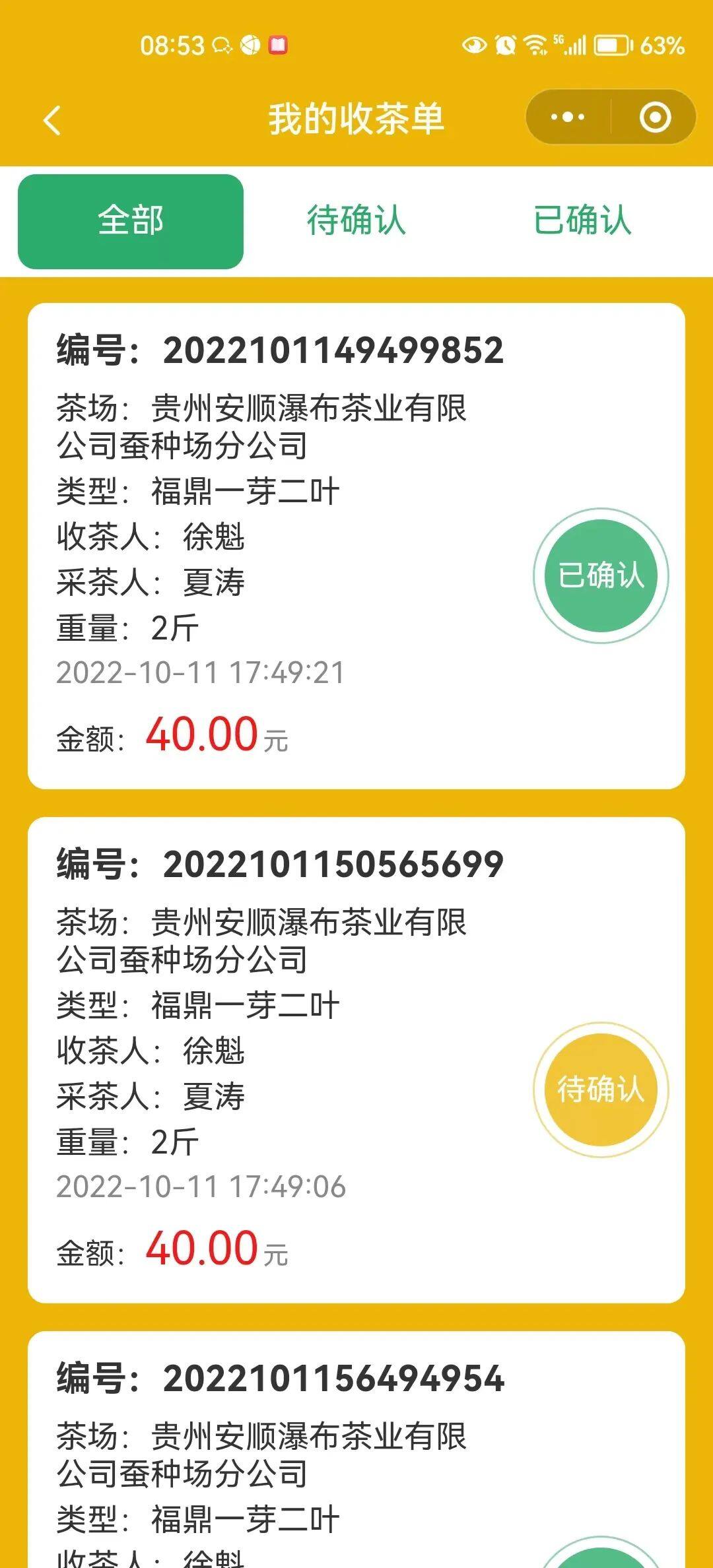为了解决这一系列难题,10月12日,贵州安顺瀑布茶业正式研发推出了“收茶青”小程序。“我们茶青收购系统就是以大家耳熟能详的‘健康码’、‘核酸码’使用逻辑为基础研发的,操作十分简单便捷。”负责人介绍。