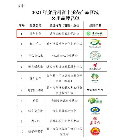4月,贵州省农产品区域公用品牌价值评价结果正式发布,“贵州绿茶”荣获“贵州省十强农产品区域公用品牌”榜首。通过多年培育,“贵州绿茶”品牌率先在全国打响,影响力和知名度越来越响,产品品质快速提升,企业集群逐步形成,茶产业发展和品牌建设成效显著,为贵州“品牌强农”提质增效探索出了一条积极有效的路径。